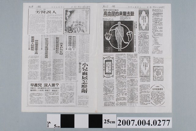 1. 本物件為台灣衛生新聞社發行《台灣衛生新聞》民國80年7月1日第2026期。此物件共有4版,第1版有刊物標頭台灣衛生新聞以及發行訂閱資訊。第1版頭條為母親肝臟移植給病兒 美國完成活體移植術,另外還有其他新聞。第2版頭條為高血壓的來龍去脈,另有其他資訊,例如世界民族搜奇。第3版頭條為劣醫誤人,另有其他報導,例如AIDS特別報導。第4版頭條為科學家發現新證據 17染色體與乳癌有關,另有其他生活資訊,例如牛奶空盒新用途等。