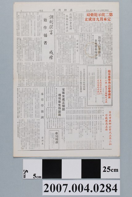 本物件為《藥師週刊》民國71年6月7日第3至4版。第3版頭條為接續上期的優良藥品製造標準GMP,以及修正藥物藥商管理法施行細則部分條文。第4版頭條為第二批示範藥局定本月九日成立,另有其他醫藥新聞和讀者投書等。