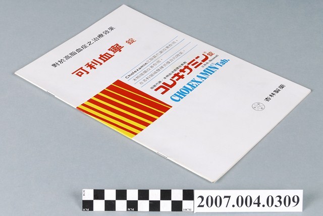 本物件為杏林製藥「可利血寧錠對於高脂血症之治療效果」冊。書皮為軟頁。封面印有對於高脂血症之治療效果、可利血寧錠、Cholexamin、脂質代謝、末梢血液循環改善劑等字樣。無目錄,內容以藥效於各科別利用來區分,例如內科領域婦產科領域、皮膚領域、泌尿科領域等。此冊無出版資訊。