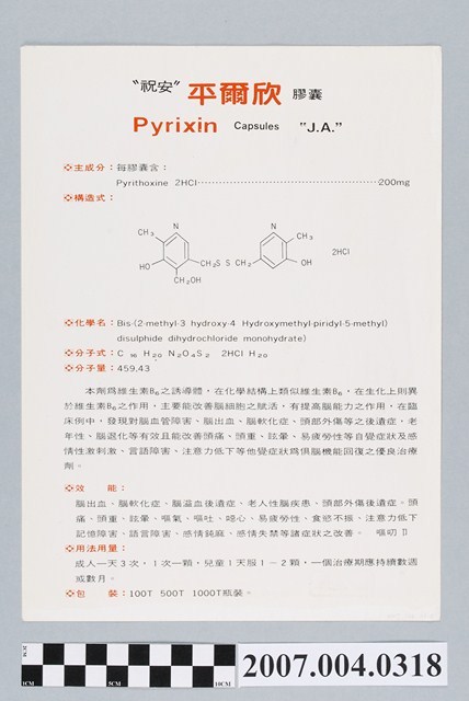 本物件為祝安製藥工業有限公司出品平爾欣膠囊藥品廣告單。廣告單為單張紙,單面有字。正面印有腦代謝機能改善劑、平爾欣、Pyrixin等字樣,以及頭部側面圖。背面印有成分、效能、用法用量等內容。本藥品可治療腦出血、腦軟化症、腦溢血後遺症、頭痛、食慾不振等。