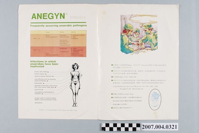 1.本物件為法台化學股份有限公司代理愛汝清注射液藥品摺頁。摺頁為1張紙,對折,共有4面。封面印有ANEGYN、愛汝清注射液、是目前唯一對厭氧菌具殺菌作用的革命性藥物字樣,以及注射液藥瓶圖案。內頁與封底則印有藥理說明、適應症、用法用量、副作用等內容。
