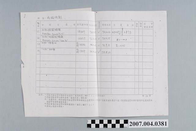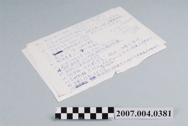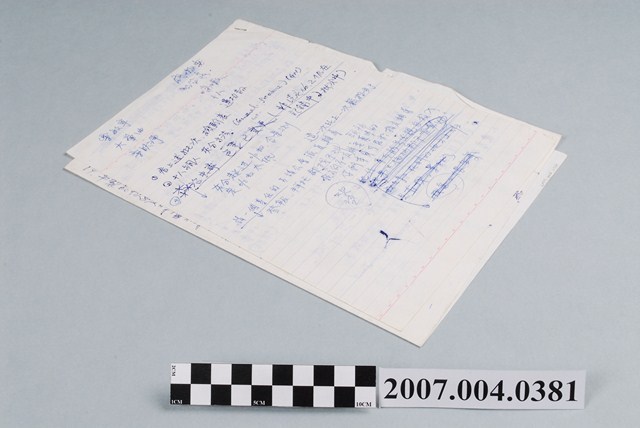 本物件為手寫筆記。共有2張紙。一張上面列有多種藥名,例如樂敏寧、運功散、十八銅人等。另一張則分列許多項,有29項,內容有關於印刷、檢驗等。