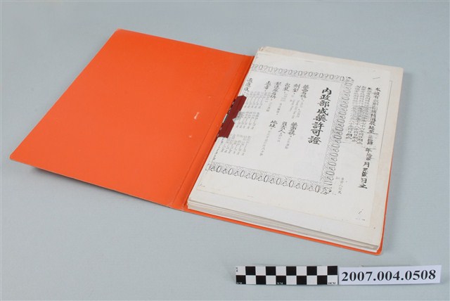 本物件為三和藥廠三和正氣丹文檔。共有4項文件,夾在紅橘色資料夾中,資料夾封面有手寫之三和正氣丹字樣。