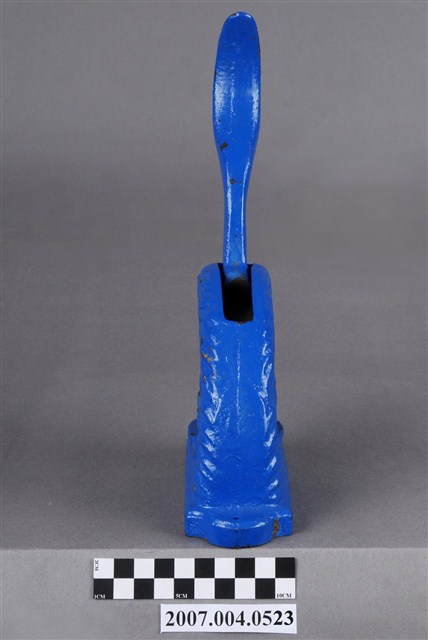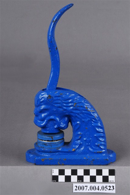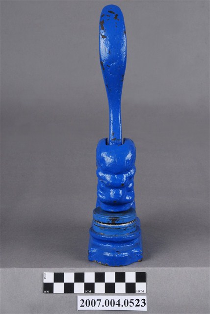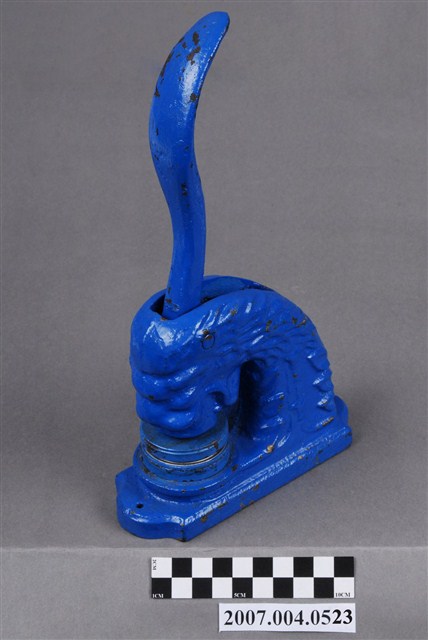 本物件為手壓鋼印機。鋼印機外觀塗有藍漆,無法觀察原色,最上方有按壓握把。壓印出來的文字有台灣省公共衛生研究所和PROVINCIAL INSTITUTE OF HEALTH TAIWAN PROVINCE CHINA。