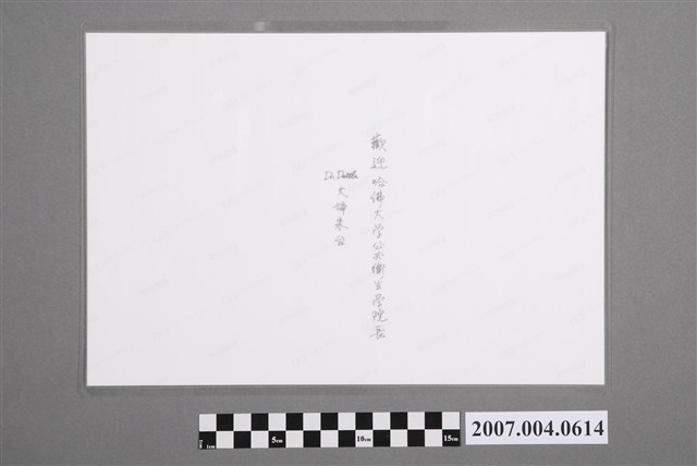1. 本物件為1964年陳拱北於哈佛公共衛生學院校友會合照。黑白照片中有20人,有男有女,分成三排拍照。女生著旗袍或洋裝,男生皆著西裝。照片說明文字為HARVARD PUBLIC HEALTH ALUMNI、TAIWAN、REPUBLIC OF CHINA、DECEMBER 12. 1964。照片背面有字,歡迎哈佛大學公共衛生學院長 Dr. Dettle夫婦來臺。