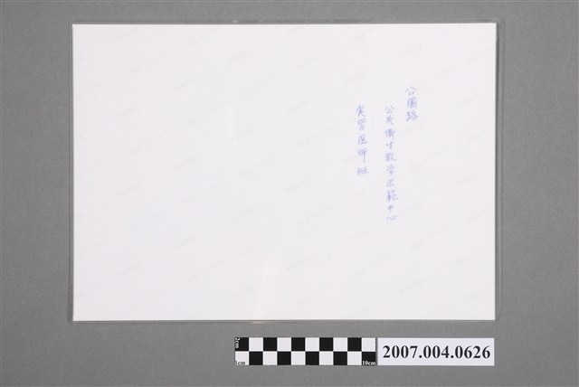 1. 本物件為陳拱北等人於公共衛生教學示範中心合照。黑白照片中共有9人,眾人站在建築物前拍照,陳拱北站在正中間。照片左下角有字,TAIPEI PUBLIC HEALTH TEACHING AND DEMONSTRATION CENTER。照片背面有字,公園路、公共衛生教學示範中心、實習醫師班。