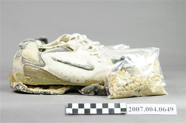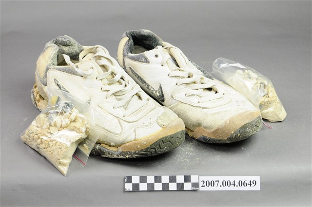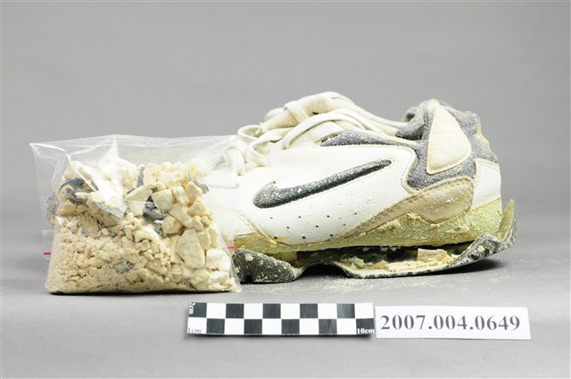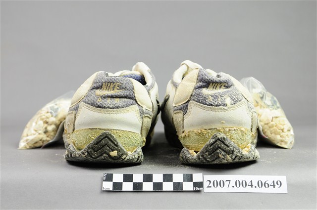 1.本件為耐吉(Nike)運動鞋一雙,鞋身以白色皮革、灰白色麂皮革及深色織布等材質組合製作,鞋身兩側有該品牌標誌,鞋領口後側也繡有耐吉商標「Air」黃色英文字樣。鞋底部分是耐吉特有的air設計,其中白色PU層因年代久遠分解碎裂,鞋底碎塊裝進透明塑膠袋裡保存。