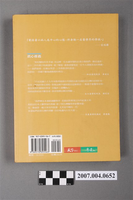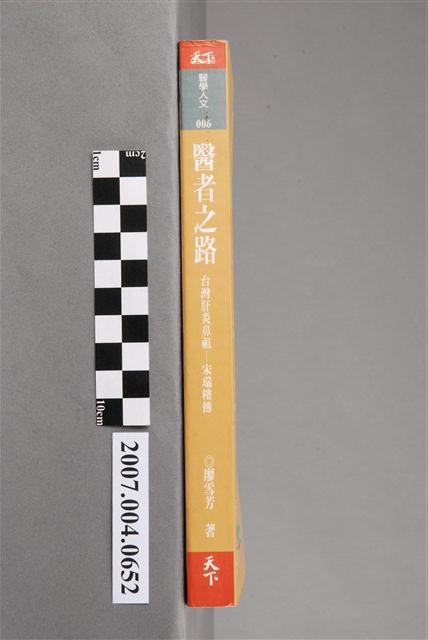 本物件為廖雪芳著《醫者之路:台灣肝炎鼻祖─宋瑞樓傳》。封面有宋瑞樓之照片以及書名文字,另有黃達夫、陳定信和廖運範推薦人字樣。封底有宋瑞樓名言和推薦序節錄。目錄有序、第一篇言教與身教、第二篇森林中的巨人、第三篇洞見垣一方以及後記與附錄。此書由天下雜誌,於西元2002年出版。