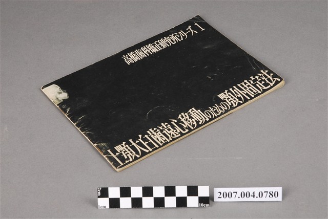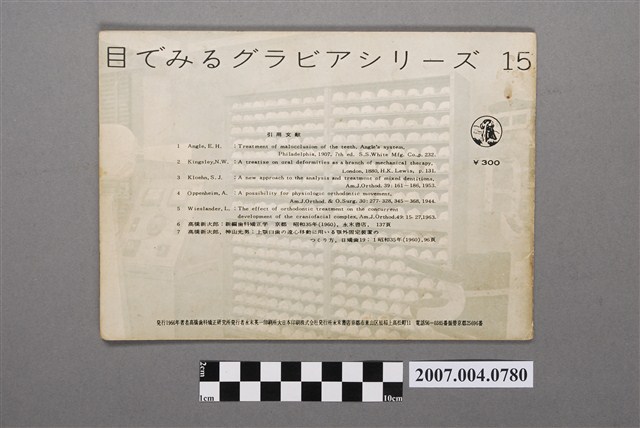 本物件為高橋齒科矯正研究所著《上顎大臼齒遠心移動のための顎外固定法》。封面為黑色,左上角有一側面頭顱X光照片,封面文字有高橋齒科矯正研究所シリーズ1、上顎大臼齒遠心移動のための顎外固定法。本書內容應與利用上顎大臼齒的後移來改善臼齒的關係有關,目次分為13萹文章,有5篇文章為案例。本書由永末書店,於西元1966年發行。