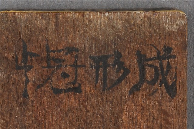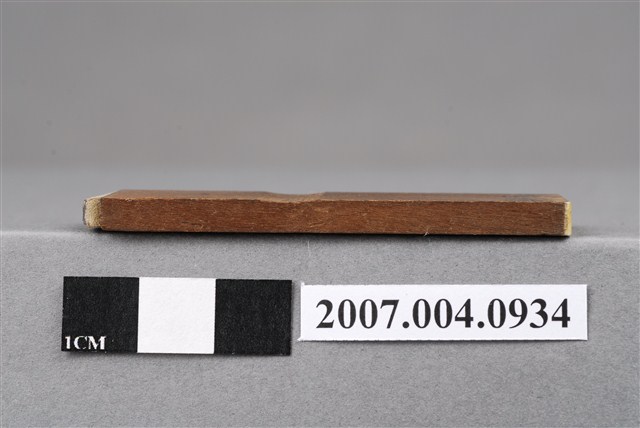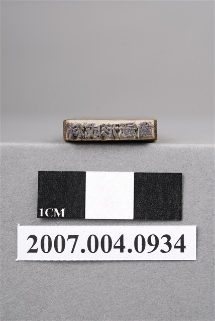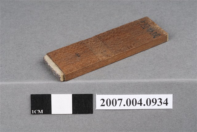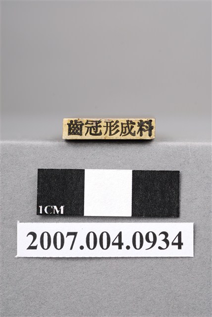 本物件為齒冠形成料印章,該只印章由木頭製成,呈長方形,中間部分略有凹陷以方便拿取使用,印章尾端寫有「齒冠形成料」五字以供辨識,尾端木頭處亦用黑字寫著「齒冠形成」四字,木頭尾端略有磨損,前端部分保持乾淨,較無使用過的藍色印泥痕跡,整體保持完整。