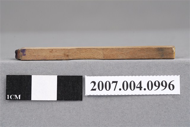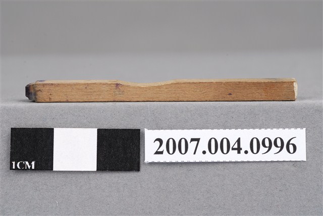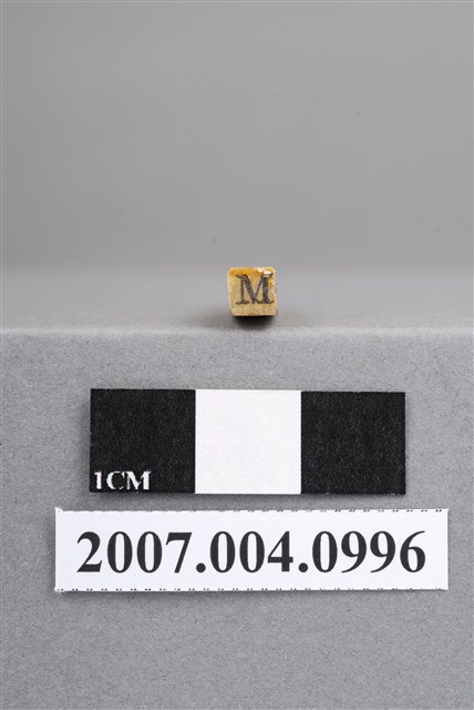 本物件為M印章,長方體狀,木質材質。該印章刻字處同為木質,刻有「M」字樣,雕刻方式為陽刻,有使用痕跡。