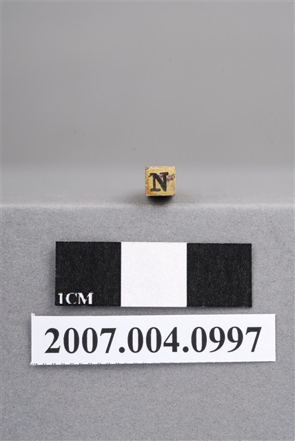 本物件為N印章,長方體狀,木質材質。該印章刻字處同為木質,刻有「N」字樣,雕刻方式為陽刻,有使用痕跡。