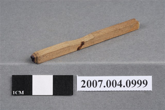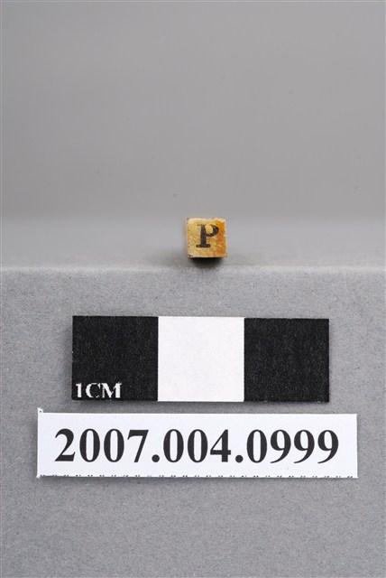 本物件為P印章,長方體狀,木質材質。該印章刻字處同為木質,刻有「P」字樣,雕刻方式為陽刻,有使用痕跡。