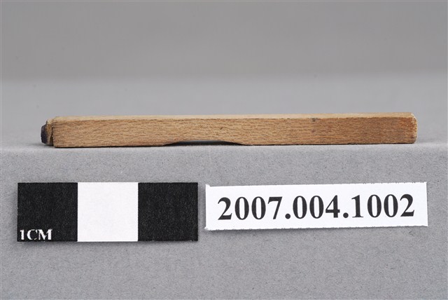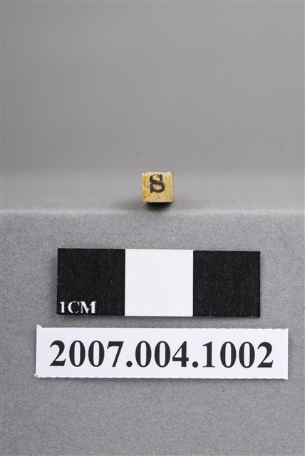 本物件為S印章,長方體狀,木質材質。該印章刻字處同為木質,刻有「S」字樣,雕刻方式為陽刻,有使用痕跡。