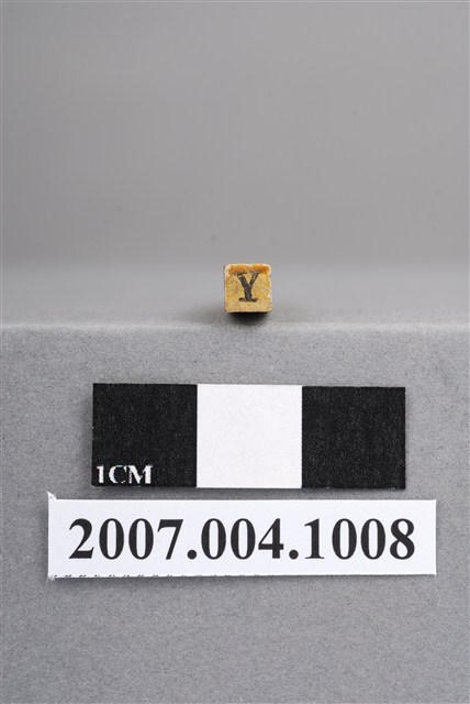 本物件為Y印章,長方體狀,木質材質。該印章刻字處同為木質,刻有「Y」字樣,雕刻方式為陽刻,有使用痕跡。