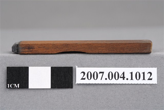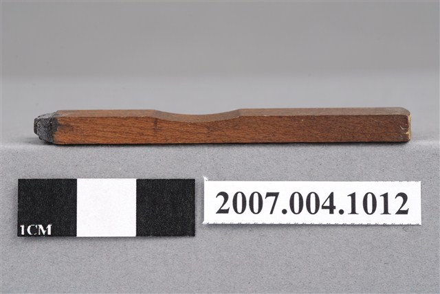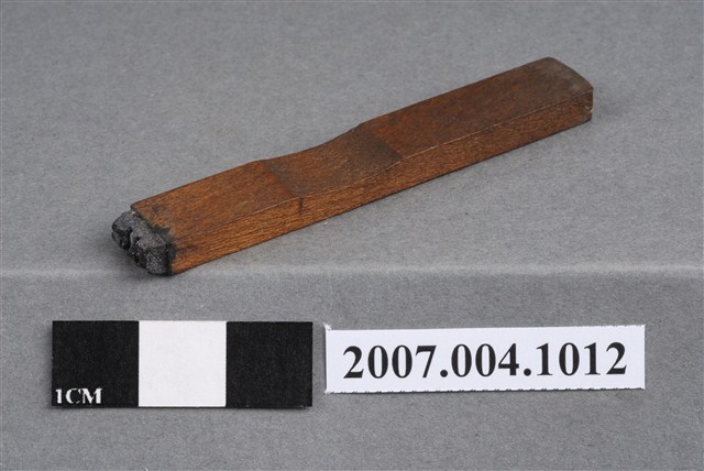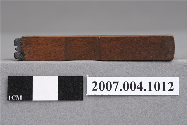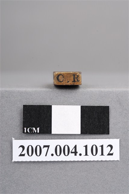 本物件為C.R印章,長方體狀,木質材質。該印章刻字處同為木質,刻有「C.R」字樣,雕刻方式為陽刻,有使用痕跡。「C.R」,即牙科用語centric relation,中心關係位置。