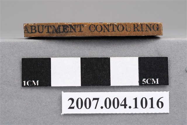 本物件為ABUTMENT CONTOURING印章,長方體狀,木質材質。該印章刻字處同為木質,刻有「ABUTMENT CONTOURING」字樣,雕刻方式為陽刻,有使用痕跡,側邊有黑色手寫「齒冠形成」。