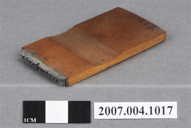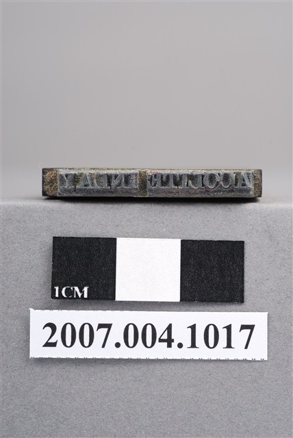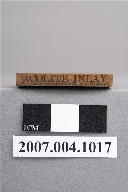 本物件為ACOLITE INLAY印章,長方體狀,木質材質。該印章刻字處同為木質,刻有「ACOLITE INLAY」字樣,雕刻方式為陽刻,有使用痕跡,側邊有黑色手寫「アコライト」。