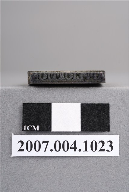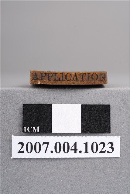 本物件為APPLICATION印章,長方體狀,木質材質。該印章刻字處同為木質,刻有「APPLICATION」字樣,雕刻方式為陽刻,有使用痕跡,側邊有黑色手寫但模糊不清。「APPLICATION」一詞於醫學術語上有敷用之意。