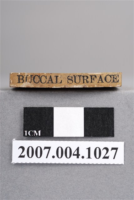 本物件為BUCCAL SURFACE印章,長方體狀,木質材質。該印章刻字處同為木質,刻有「BUCCAL SURFACE」字樣,雕刻方式為陽刻,有使用痕跡,側邊有黑色手寫「頰面」字樣。