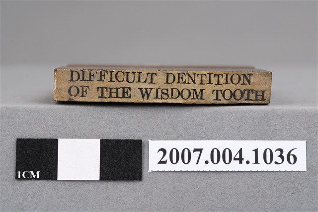 本物件為DIFFICULT DENTITION OF THE WISDOM TOOTH印章,長方體狀,木質材質。該印章刻字處同為木質,刻有「DIFFICULT DENTITION OF THE WISDOM TOOTH」字樣,雕刻方式為陽刻,有使用痕跡,側邊有黑色手寫「智齒難生」字樣。