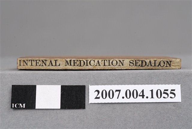 本物件為INTENAL MEDICATION SEDALON印章,長方體狀,木質材質。該印章刻字處同為木質,刻有「INTENAL MEDICATION SEDALON」字樣,雕刻方式為陽刻,有使用痕跡,側邊有黑色手寫「內服セダロン」。