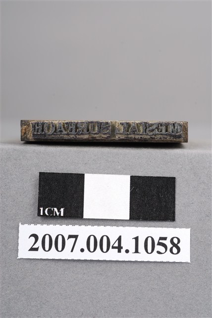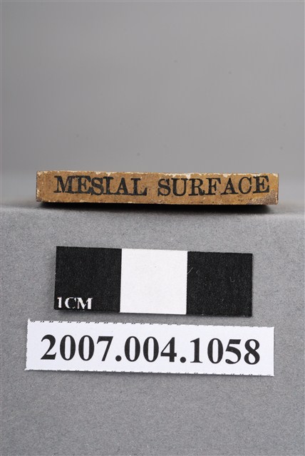 本物件為MESIAL SURFACE印章,長方體狀,木質材質。該印章刻字處同為木質,刻有「MESIAL SURFACE」字樣,雕刻方式為陽刻,有使用痕跡,側邊有黑色手寫「近心面」。