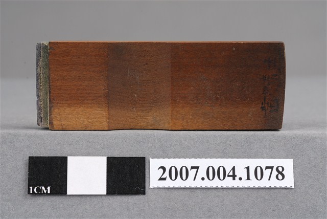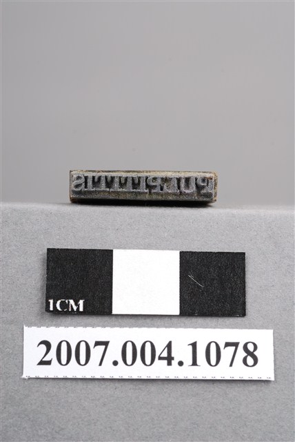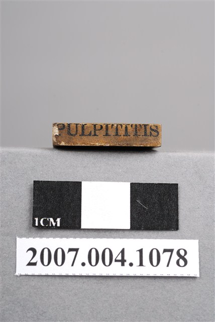本物件為PULPITITIS印章,長方體狀,木質材質。該印章刻字處同為木質,刻有「PULPITITIS」字樣,雕刻方式為陽刻,有使用痕跡,側邊有黑色手寫「齒髓炎」。