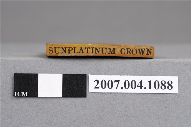 本物件為SUNPLATINUM CROWN印章,長方體狀,木質材質。該印章刻字處同為木質,刻有「SUNPLATINUM CROWN」字樣,雕刻方式為陽刻,有使用痕跡。