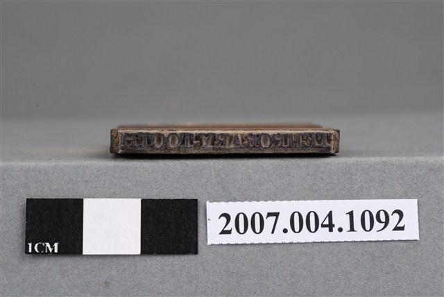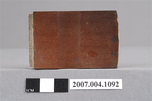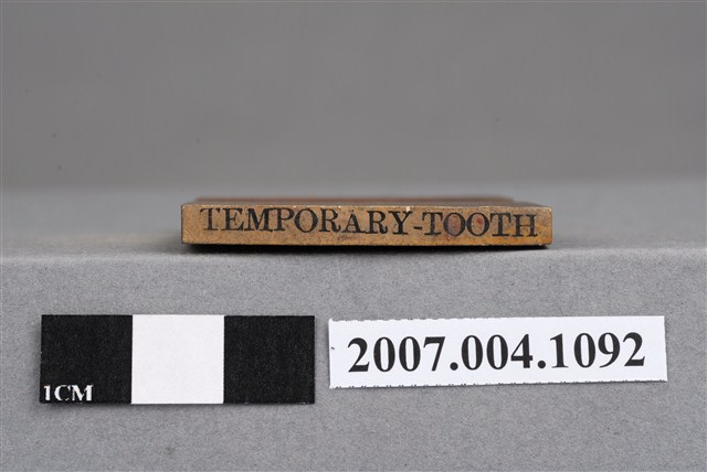 本物件為TEMPORARY-TOOTH印章,長方體狀,木質材質。該印章刻字處同為木質,刻有「TEMPORARY-TOOTH」字樣,雕刻方式為陽刻,有使用痕跡,側邊有黑色手寫「乳齒」。