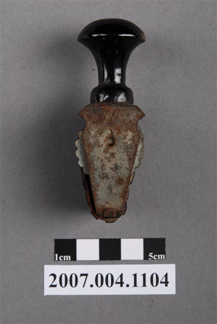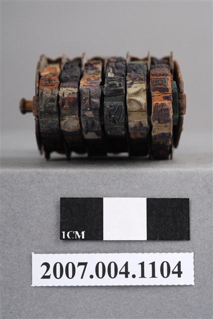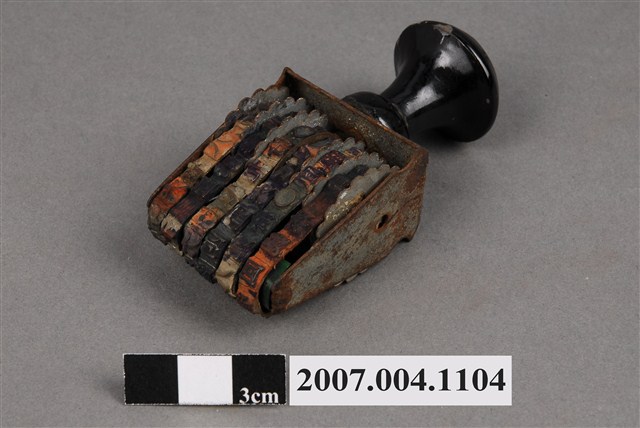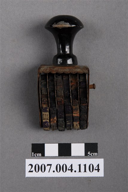 本物件為中文數字印章,木質、金屬複合材質。印紐處為黑色,下方延伸為6軌可手動轉換的中文數字印章,雕刻方式為陽刻,有使用痕跡。