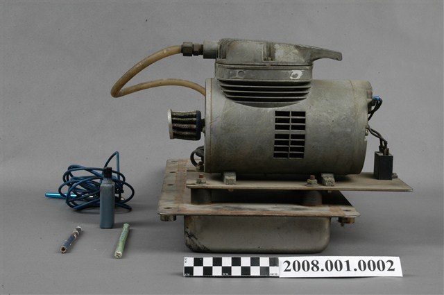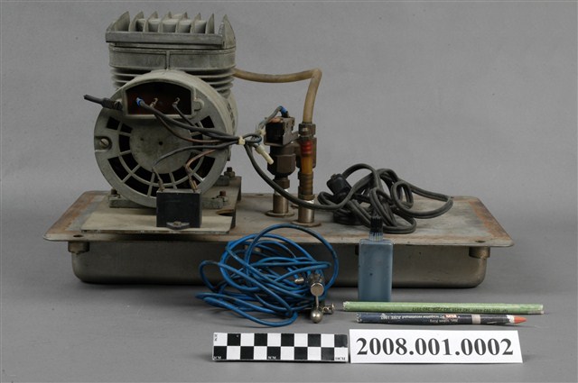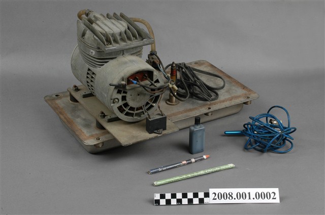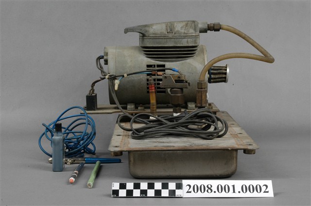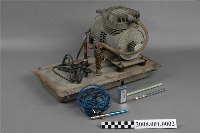 本物件包含托瑪士空氣壓縮機、Badger噴嘴及Faber-Castell墨水裝置,和2支炭筆,由捐贈者吳信政教授組裝成噴槍筆,為地圖繪製儀器。