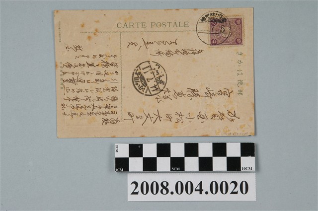 1.本物件以臺灣通信方式為主題,彩色樣式。正面為三張圖像,由右至左分別為淡水長崎間海底電線布設之圖像,圖像下方以漢字書寫「淡水長崎間海底電線布設(淡水路上工事)」、阿緱廳竹仔門附近灌溉水路、富基角無線電信。明信片上方有兩人圖像,右方人像為佐久間左馬太。明信面右上方有一藍紫色戳章,可見「臺灣總督府始政第十五回紀念」、「44.6.17」等字樣。明信片以花朵為背景。背面為主要書寫處。右上角為郵票黏貼處,該處有一紅色郵票,可見「大日本帝國郵票」、「壹錢五厘」等字樣,上頭有一黑色圓型戳章,可見「台灣」字樣。右側有以漢字、平假名書寫之「郵便はがき」,上方以英文字母書寫「CARTE POSTALE」。背面書寫處以漢字書寫「宮崎騰惠樣」與其信件內文。明信片中間有一黑色戳章,可見「44.7.11」等字樣。明信片左方以漢字書寫「臺灣總督府發行」、「東京印刷株式會社印行」。2.日治初期,臺灣電信原以有線電信為主,作為島內、日本內地與國外的聯繫,大致以臺北電信局為中心。至大正年間隨著無線電技術發展,最初作為備用設備,後隨著臺灣與日本內地通信日漸頻繁,轉為常設設備。