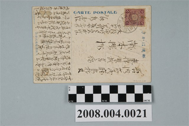 1.本物件以交通船為主題,彩色樣式。正面為笠戶丸之圖像,其背景為插圖漫畫式的畫風,主要為藍色、淺黃色,有星星與樹、鳥類的圖案。笠戶丸的圖像下方以漢字書寫「大阪商船株式會社神戶基隆直航船」。背面為主要書寫處。右上角為郵票黏貼處,該處有一紅色郵票,可見「大日本帝國郵票」、「壹錢五厘」等字樣,上頭有一黑色圓型戳章,可見「后10-12」等字樣。右側有以漢字、平假名書寫之「郵便はがき」,上方以英文字母書寫「CARTE POSTALE」。背面書寫處以漢字書寫「台灣嘉義廳烏樹林東洋製糖」、「瀧本潔樣」與其信件內文。明信片中間有一黑色戳章,可見「44.7.11」等字樣。明信片左方以漢字書寫「大阪商船株式會社」、「光村印刷株式會社印行」。2.笠戶丸屬東洋汽船株式會社,屬當時臺灣與日本航運的重要交通運輸公司,曾承載百名移民前往南美。