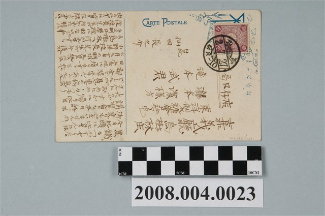 1.本物件以北投公園為主題,黑白樣式。正面為北投公園內一景,樹木林立、有一座石橋之圖像。明信片下方由右至左以漢字書寫「北投公園」、以英文字母書寫「THE HOKUTO PARK」、以漢字標示「杉田書店發行」。背面為主要書寫處。背面右上角為郵票黏貼處,該處有一紅色郵票,上頭有一黑色戳章,可見「台北」、「2.7.27」、「后8-10」等字樣。右側有以漢字、平假名書寫之「郵便はがき」,上方以英文字母書寫「CARTE POSTALE」。該明信片由「台北 仙田長之介」寄給「嘉義廳烏樹林庄東洋製糖會社 瀧本潔 潼本武君」。2.北投公園於西元1911年通過臺北廳官有地使用許可,並於1912年完工。1913年北投公共浴場完工,鄰近北投車站。
