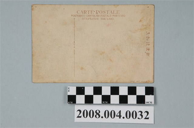 1.本物件以原住民為主題,黑白樣式。正面為一男子穿著深色長袖上衣、深色短褲,站立於人頭骨櫃前方的圖像。該人頭骨櫃以木材、石板搭成,每層皆放置乾枯的人頭骨。明信片下方以漢字標示「不許復製」,以漢字書寫「臺灣阿緱廳外文社生蕃二股頭人首棚」、以英文字母書寫「Trophy of Heab-hunter Formosa.」(註:Heab應為Head之訛誤)。背面右上角為郵票黏貼處,右側有以漢字、平假名書寫之「郵便はがき」,上方以英文字母書寫「CARTE POSTALE」、「Postkarte-Cartolina Postale-PostCard」、「OTKPBITOE IINCBMO」,明信片中間以英文字母標示「MADE IN JAPAN」。2.原住民獵首習俗於清代稱作「出草」,於日治時期稱作「馘首」,事臺灣原住民重要習俗。獵首之於原住民的象徵意義主要為「獲得戰功」,在部落內被視為展現英勇的象徵。