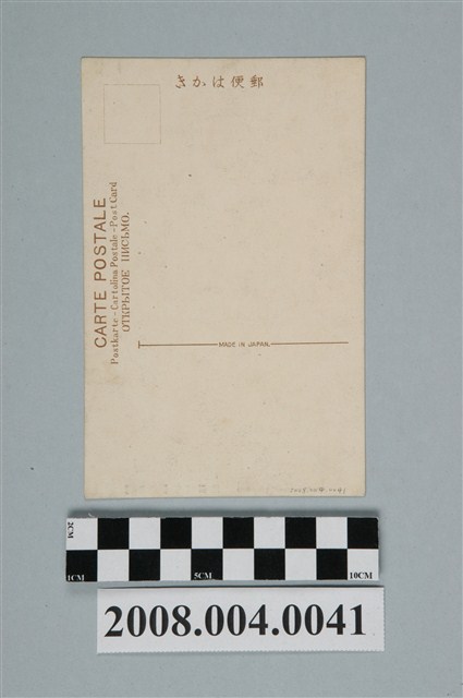 1.本物件以臺灣藝妓為主題的明信片,黑白樣式。正面為三名女子身著淺色傳統服裝之圖像,由右至左,分別坐姿、站姿、坐姿。左右兩名坐在椅子上的女子,大腿上皆披有薄巾。且三名女子皆將頭髮盤起、纏足。明信片下方以漢字標示「不許復製」,並以漢字書寫「臺灣藝妓」﹑以英文字母書寫「Formosan Singing Gril.」(註:Gril應為Girl的訛誤)。背面右上角為郵票黏貼處,右側有以漢字、平假名書寫之「郵便はがき」,上方以英文字母書寫「CARTE POSTALE」、「Postkarte-Cartolina Postale-PostCard」、「OTKPBITOE IINCBMO」。明信片中間以英文字母標示「MADE IN JAPAN」。2.藝旦為臺灣日治時期出現的一種女性職業,通常熟知音律且識字,會於高級酒樓中彈琴、吟唱、伴舞、作戲等,是為高級文人仕紳餐會中伺陪和買笑談天的對象,藝旦不賣身,只賣其技藝,其演出中表演的戲劇,更是開創臺灣女性演劇之先鋒,其工作場所接為上等高級酒樓,如大稻埕的江山樓、蓬萊閣,因其工作性質的關係,藝旦之穿著打扮較為時尚,談吐較為高雅,被視為新時代女性的象徵。