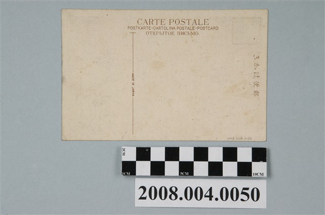 1.本文物為以龍田家旅館前庭之白水溪釣魚為主題之明信片,正面為龍田家旅館前庭之白水溪釣魚黑白照片,畫面中可見1人蹲於溪邊岩石上,正在釣魚,右下有1段文字「溫白水溪ノ魚釣龍田家旅館前庭」,左下有1段文字「關仔嶺龍田家發行」;背面為空白明信片橫式書寫面,以黑色單色印刷,右上為郵票黏貼處,右側有「郵便はかき」字樣,上方有「CARTE POSTALE」及2行字樣,由上而下分別為「POSTKARTE- CARTOLINA POSTALE-POSTCARD」、「OTKPbITOE IIИCbMO」,中左處有「MADE IN JAPAN」字樣。2.關子嶺位於臺南市白河區東側,為含硫磺成分的鹼性碳酸溫泉,在日治時期與陽明山、北投、四重溪三個溫泉勝地並列為臺灣四大名湯。龍田家即為今日關子嶺大旅社之前身,創立於西元1905年,其本身並沒有浴室,是與隔壁之「吉田屋」共用一浴場,曾於西元1913年改建浴場,其泡湯等級分為3種,特湯最高級,上湯次之,並湯則最為廉價。