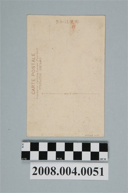 1.本文物為以關仔嶺溫泉場附近瀑布為主題之明信片,正面為瀑布黑白照片,畫面中可見1人站於瀑布落下處旁,與瀑布和照,瀑布為細長型,從高處落下,右下有1段文字「關仔嶺溫泉場附近瀑布」,左下有1段文字「關仔嶺龍田家發行」;背面為空白明信片直式書寫面,以黑色單色印刷,左上為郵票黏貼處,上方有「郵便はかき」字樣,左側有「CARTE POSTALE」及2行字樣,由左至右分別為「Postkarte- Cartolina Postale-Post card」、「OTKPbITOE IIИCbMO」,中左處有「MADE IN JAPAN」字樣。2.關子嶺位於臺南市白河區東側,為含硫磺成分的鹼性碳酸溫泉,在日治時期與陽明山、北投、四重溪三個溫泉勝地並列為臺灣四大名湯。龍田家即為今日關子嶺大旅社之前身,創立於西元1905年,其本身並沒有浴室,是與隔壁之「吉田屋」共用一浴場,曾於1913年改建浴場。聽水庵設立於1914年,為關子嶺溫泉貴賓館,1933年時日本皇族伏見宮親王曾經於此下榻,其鄰近瀑布,名稱即從可聆聽瀑布水聲而得。