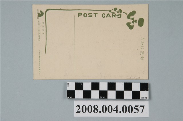 1.本文物為以明治紀念拓殖博覽會朝鮮貴人捧起人參為主題之明信片,正面為朝鮮貴人捧起人參,畫面中可見1身穿韓式傳統衣服之女子,將人參捧起,底給前面之人,右下有1段文字「明治紀念拓殖博覽會朝鮮貴人の人參を捧ぐ」,左下有1段文字「AND COLONIAL EXHIBITION AT TENNOJI PARK.」;背面為空白明信片直式書寫面,以深綠色單色印刷,上方有「郵便はかき」字樣,右下有「大阪備後町四栗本商店發行」字樣,左下有「不許複製」及「KURiMoto & Co. OSAKA」2行字樣,另有1馬頭樣式之商標,左側有「POST CARD」字樣,左上有花卉圖案。2.明治紀念拓殖博覽會舉辦於西元1912年,除作為展示明治天皇期間之國運氣勢外,也於博覽會中展示各殖民地的殖民成果,其舉辦地點為大阪天王寺公園。朝鮮部內展示各類朝鮮之產品,如農產品、林業品、工藝品等,亦有展示鴨綠江鐵橋模型、景福宮整體建築之一的慶會樓模型等。