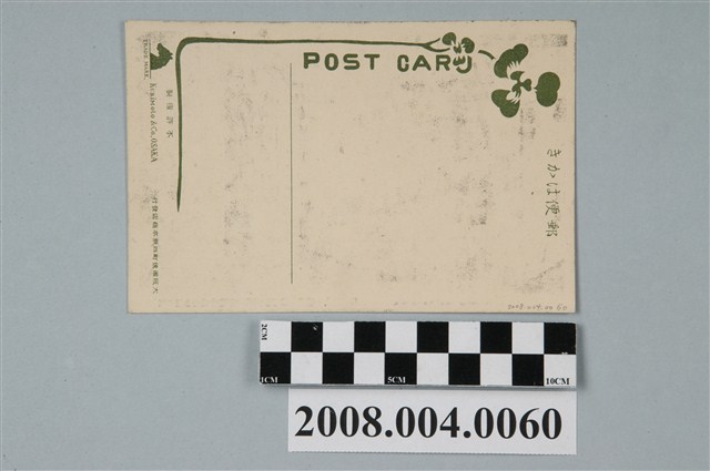 1. 本物件為以明治紀念拓殖博覽會滿洲參考館滿鐵中央試驗所為主題之明信片,其正面為中央試驗所黑白照片,影像中間偏右位置有一門口,上方匾額有「中央試驗所」5字,其上方有1行小字無法辨識,兩側為中式花紋之門窗,影像下方有「明治紀念拓殖博覽會」、「滿洲參考館滿鐵中央試驗所」、「THE TAKUSHOKU EXPOSITION AT TENNOJI PARK.」。背面為空白明信片橫式書寫面,以深綠色單色印刷,右上方有2三葉草圖樣,右側有「郵便はがき」,左下方有「大阪備後町四栗本商店發行」,左上有1馬頭側面黑影,及有「TRADE. MARK,」,其下方「不許複製」、「KURiMoto& Co., OSAKA」,中間偏右有「POST CARD」,中間偏左位置有分隔線。2. 西元1913年為了紀念明治時期的功業,於4月21日至6月19日大阪天王寺公園舉辦「明治紀念拓殖博覽會」,其建築物包含美術館、機械館、公會堂、勸業館、風光館等。影像中位置推測可能位於美術館內,美術館於展覽會中安排為展示參考品之陳列。