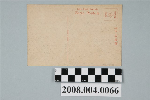 1. 本物件為以臺南赤嵌樓為主題之明信片,其正面為赤崁樓黑白照片,影像中左右兩側各有1中式塔樓建築物,其前方上有1中式平房建築,影像下方標有「臺南赤崁樓」、「(蘭人建築)」、「KONO.1」。背面為空白明信片直式書寫面,以紅橙色單色印刷,左上方框中有星形圖樣,上有「TRADE」、下有「MARK」,明信片上方有「郵便はがき」,左側有「Union Postale Universelle」、「Carte Postale」,中間有一分隔線,中央有「MADE IN JAPAN」。2. 赤崁樓係西元1653年由荷蘭人所建,時稱普羅民遮城、プロビンシヤ城址、紅毛城;1661年鄭成功驅逐荷蘭人後將此樓稱為承天府以統治臺灣,1879年清廷在此基礎上建文昌閣、海神廟與蓬壺書院,西元1895年後曾作為陸軍衛戍醫院及臺南師範學校使用。現存建物為其殘跡,以及海神廟與文昌閣。