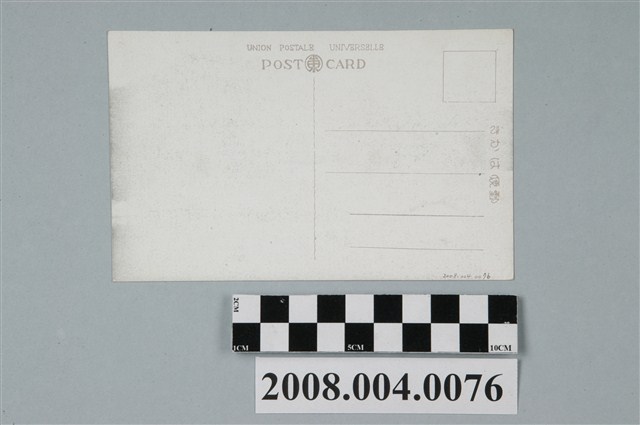 1. 本物件為以臺南名所億載金城為主題之明信片,其正面為億載金城黑白照片,影像右方為1水面上有漣漪,其上方搭建有磚造橋梁,並有石製圍欄,影像中央偏右位置有1磚製方形之建築物,其門口為圓拱狀,上方標有「億載金城」,影像右下方標有「(台南名所)」、「億載金城」、「安平舊砲台」。背面為空白明信片橫式書寫面,以黑灰色單色印刷,右上方框為郵票黏貼處,右側有「郵便はがき」,上方有「UNION POSTALE UNIVERSELLE」、「POST CARD」,中央分隔線上方有一圓形圖樣,其中有疑似「東」或「山東」字樣。2. 億載金城又稱二鯤鯓砲臺。西元1874年牡丹事件後清廷派沈葆楨任福建巡臺使節,沈葆楨為了防範日本因此拆除熱蘭遮城,再以這些建材建造億載金城,最後於光緒二年(1876年)完工,當時共有大砲5門、小砲4門並配置臺灣安平水師副將周振邦及300名兵士駐守,入口城門題字「億載金城」為沈葆楨落款。西元1895年日本領臺後在南部的劉永福軍也曾在此與日本軍接頭後向日軍投降。