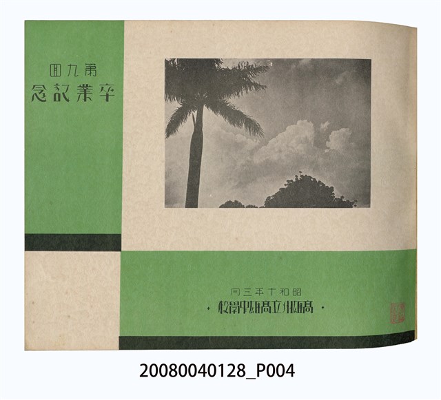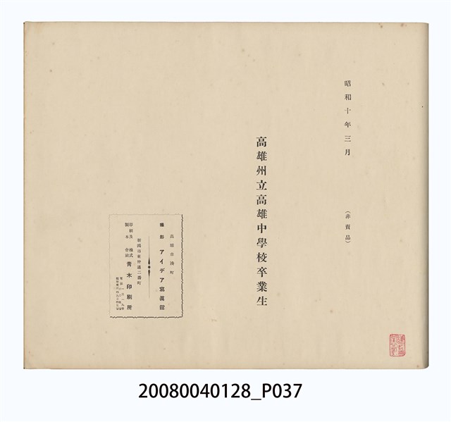 本件為高雄州立高雄中學校第9屆畢業紀念冊,製作時間為昭和10年(1935)3月,黑白印刷,由高雄市アイデア寫真館攝影,新潟市青木印刷所印刷。內容主要為校園景觀照、教職員、學生大頭照、課堂照、社團成員合照、軍事訓練照等。高雄州立高雄中學校(今高雄中學),1922年於現址創立,1944年因應左營增設第二中學校,因此更名為「高雄州立高雄第一中學校」,戰後兩校再度合併,改稱「臺灣省立高雄中學」。該校名沿革,如下:1922年,高雄州立高雄中學校;1944年,高雄州立高雄第一中學校1945年,臺灣省立高雄第一中學;1947年,臺灣省立高雄中學;1970年,臺灣省立高雄高級中學;1979年,高雄市立高雄高級中學。