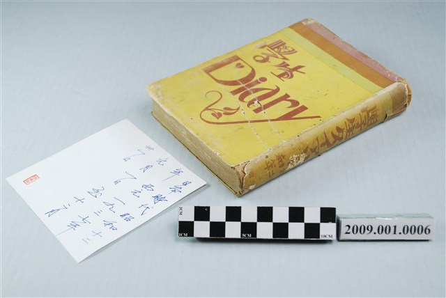 1. 陸季盈昭和12年(1937年)所寫日記,黃色書衣,封面題名「學生 DIARY」,外覆塑膠封套,內文全以日文書寫。 2. 陸東原先生便條紙附註「日本時代昭和十二年(西元一九三七年)元月一日至十二月三十一日。