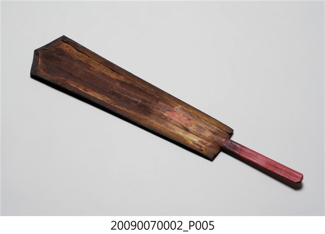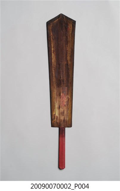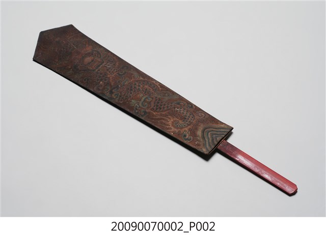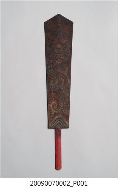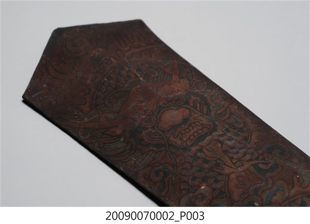本件令牌為上寬下窄的尖首圭造形,以木作彩繪方式製作,下方有裝有握柄,整體牌面已因污漬而使圖紋稍顯模糊。令牌上端做圭首式樣,正面彩繪一條頭部在上、身軀在下的正面蟠龍紋,龍身左右蜿蜒盤繞,龍尾下方繪有山嶽海浪紋飾,背面無彩繪,僅在下方貼有一小張紅紙,紙邊已殘缺,殘留「四美」二字。