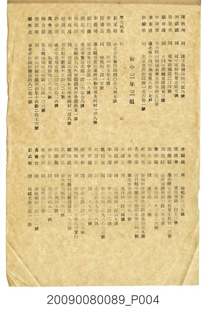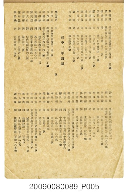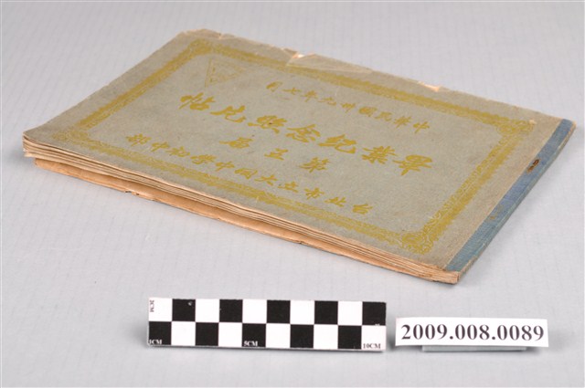 本件為臺北市立大同中學初中部第5屆畢業紀念冊,製作時間為民國39年(1950)7月,黑白印刷,封面印有「中華民國卅九年七月」、「畢業紀念照片帖」、「第五届」、「台北市立大同中學初中部」等字樣。內容主要為校門照、教職員照、畢業生團體照、校長照、朝會照、童子軍檢閱、校外教學照片等,並附有畢業生名錄。臺北市立大同中學(今臺北市立大同高中),其前身為創立於1935年的「私立臺北國民中學」,最初借用私立成淵學校(今臺北市私立成淵高中)校舍授課。1939年位於大龍峒町的新校舍落成,遷校後改稱「財團法人臺北國民中學校」,1946年,學校由臺北市政府接管,校地幾經遷徙,1950年時校址應位於今臺北市新生南路金華國民中學現址,其後於1958年遷至長春路現址。該校名沿革,如下:1935年,私立臺北國民中學;1939年,財團法人臺北國民中學校;1945年,私立大同中學;1946年,臺北市大同中學 ;1968年,臺北市立大同國民中學;1992年,臺北市立大同高級中學。