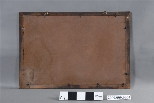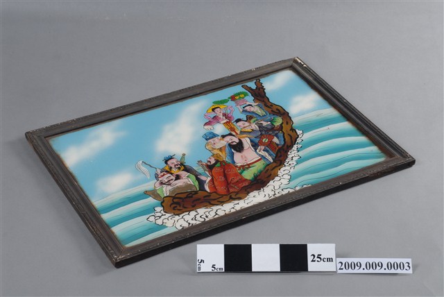 本件為八仙過海玻璃畫神明彩,畫中八仙乘於木舟之上,左起依序為鐵枴李(綠衣)、呂洞賓(藍黑衣)、曹國舅(紅衣)、漢鐘離(袒胸)、張果老(黃衣)、韓湘子(吹笛)、何仙姑(紫衣)、藍采合(舉花籃)。畫像裱框。畫中寓意借助眾仙的神通和法寶驅邪祈福之意義。玻璃畫是將畫稿人之底稿置於玻璃下,畫師在玻璃上描好圖案後,在玻璃後進行反畫。
