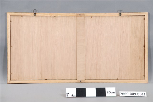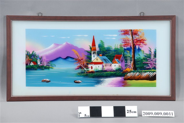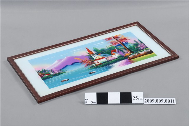 1.本件玻璃畫係以木框架與玻璃畫組合而成,繪畫主題為常見的西式風景畫,畫中河岸兩邊有位在水岸的歐式房屋,房屋周圍環繞著樹木,平靜的河面有幾處岩石,遠方則有紫色的山巒,整體畫面呈現一種寧靜悠閒的氛圍。2.玻璃畫是以顏料在玻璃的背面作晝,臺灣早期玻璃畫常見福祿壽、金玉滿堂、四季花鳥、八仙過海、神明圖像、中西式風景或人物…等具有吉祥意味的題材,畫成後題名裝框,用於祝賀婚慶、入厝、祝壽及開幕誌喜等。