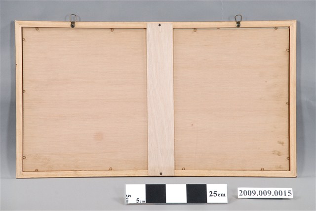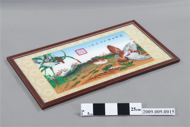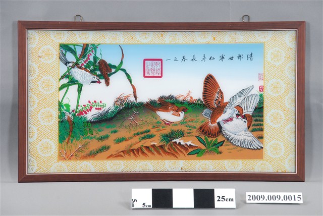 1.本件玻璃畫係以木質畫框與玻璃畫組合而成,玻璃畫內容以清朝郎世寧仙萼長春冊中的紫藤稷穗圖作為母稿,畫中兩隻小鳥在草地上翻身嬉鬧,另外兩隻小鳥在一旁以及樹梢上觀看,畫面上方則寫有「清郎世寧仙萼長春之一」及紅色落款。2.玻璃畫是以顏料在玻璃的背面作晝,臺灣早期玻璃畫常見福祿壽、金玉滿堂、四季花鳥、八仙過海、神明圖像、中西式風景或人物…等具有吉祥意味的題材,畫成後題名裝框,用於祝賀婚慶、入厝、祝壽及開幕誌喜等。
